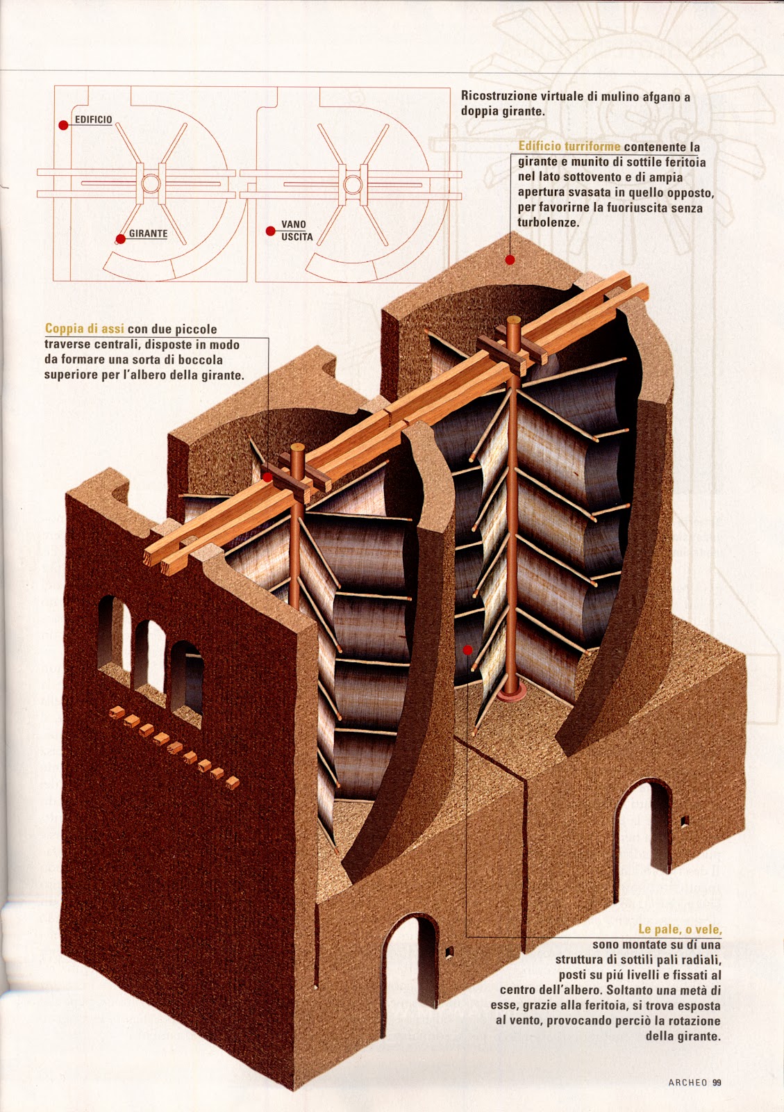 Come sempre caro architetto apprezzo molto quanto letto, ma sono deluso di sapere che in Italia esistevano due mulini fenici di cui uno a Verezze(Liguria) e l'altro a Caltanissetta (Sicilia). Ho cercato Verezze su google, ed ho appreso che per i Liguri quella costruzione è di grande valore storico:( Presso Crosa esiste una costruzione di grande valore storico, il "mulino fenicio". Fenicio perché si basa su una tecnica che pare di origine medio orientale, introdotta poi in Italia meridionale e in Spagna.In Europa esistono solo altri due esempi di mulini, uno in Sicilia e uno in Spagna; dei tre, quello di Verezzi è il meglio conservato. La particolarità di questi mulini a vento è che le pale non erano all'esterno, ma all'interno del torrione, poste in prossimità di feritoie aperte con lo scopo di convogliare l'aria verso le pale).E'assurdo scoprire di avere delle opere d'arte a casa propria e non essere in grado di farle valorizzare, di risvegliare l'interesse di evitarne la distruzione... sono deluso di vivere in una città di ignoranti come la nostra.